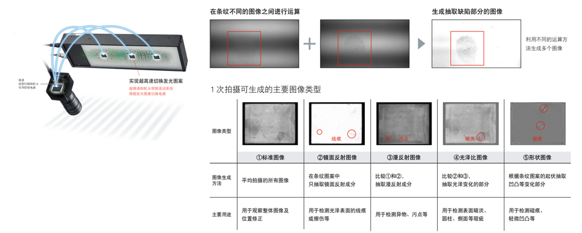 · 可通过使 CMOS 传感器和照明的发光图案控制超高速同步,可根据检测内容,从 1 次拍摄生成多张图像